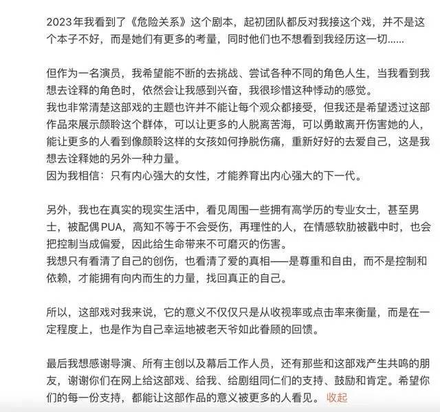《危险关系》收视爆冷,孙俪吐露:团队当初全反对!在全新热播剧《危险关系》中,孙俪打破以往大女主的霸气形象,饰演婚姻中饱受精神操控的大学讲师颜聆。她将角色创伤后的「生理厌恶」与极度压抑演绎得淋漓尽致,许多剧迷直呼「演得太窒息、隔着屏幕都觉得缺氧」。然而,过于沉重写实的题材,加上同期强档偶像剧的夹击,让这部耗资不菲的大制作收视一路下滑。